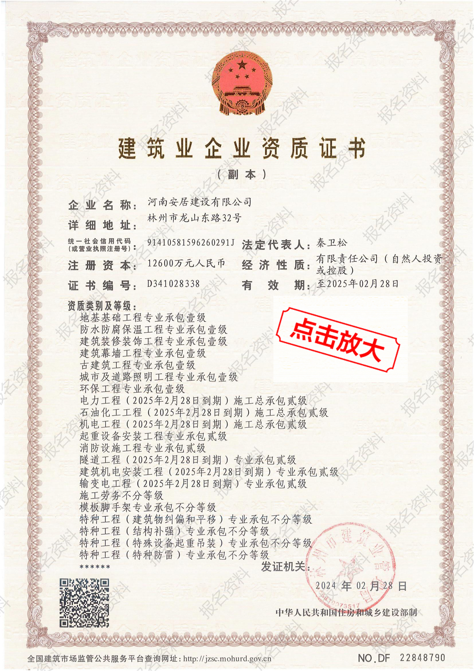 滔滔黃河哺育了中華民族拼搏向上的奮斗精神,巍巍太行造就了中原兒女的紅旗渠精神。百萬林州人下太行,鑄就了中國建筑之鄉(xiāng)響當(dāng)當(dāng)?shù)囊燮放?。河南安居建設(shè)有限公司從誕生起血液里就流淌著紅色基因,秉承“安得廣夏千萬間,大庇天下寒士俱歡顏”的擔(dān)當(dāng)精神,用鋼筋混凝土筑起了高樓大廈,也用一流品質(zhì)、家國情懷打造了安居建設(shè)的輝煌成績。公司成立于2012年,注冊資金12600萬元,公司成立至今,擁有建筑,市政施工總承包等十項(xiàng)一級資質(zhì);其他二級等資質(zhì)共二十余項(xiàng)。公司秉承質(zhì)量第一,服務(wù)為主,堅(jiān)持垂直管理,從不設(shè)立分公司等分支機(jī)構(gòu)。